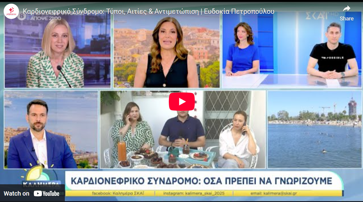 Η κ. Ευδοκία Πετροπούλου, Καρδιολόγος, Διευθύντρια της Α’ Καρδιολογικής Κλινικής του Metropolitan General, εξηγεί στην εκπομπή «Καλημέρα» του ΣΚΑΪ τι είναι το καρδιονεφρικό σύνδρομο, ποιοι τύποι του υπάρχουν, ποιες παθήσεις μπορούν να το προκαλέσουν και ποια είναι η κατάλληλη θεραπευτική προσέγγιση.